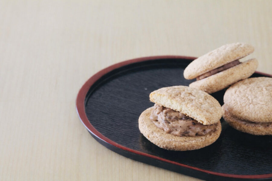 あんバターな焼き菓子。サクふわのダックワーズ生地に特製あんバタークリームをサンド。アーモンドの風味を利かせた人気商品。日持ちするので贈答品にも最適。